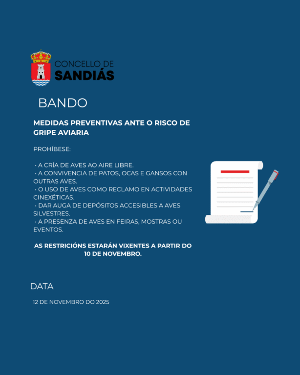 Dende o Concello de Sandiás infórmase da adopción de medidas preventivas fronte ao risco de gripe aviaria, especialmente nas Zonas de Especial Risco e de vixilancia reforzada. Estas medidas inclúen a prohibición da cría de aves ao aire libre, a convivencia de distintas especies (patos, ocas, gansos…), o uso de aves como reclamo cinexético e […]