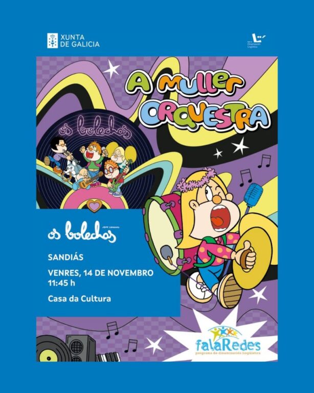 Cando: Venres, 14 de Novembro Onde: Salón de Actos da Casa de Cultura de Sandiás Hora: 11.45 h Neste teatro de monicreques, Pili Bolechas decide converterse nunha «muller orquestra» e construír un escenario musical cos seus instrumentos para ofrecer un gran concerto, a pesar de que ningún de seus irmáns parece estar moi convencido. Carlos […]