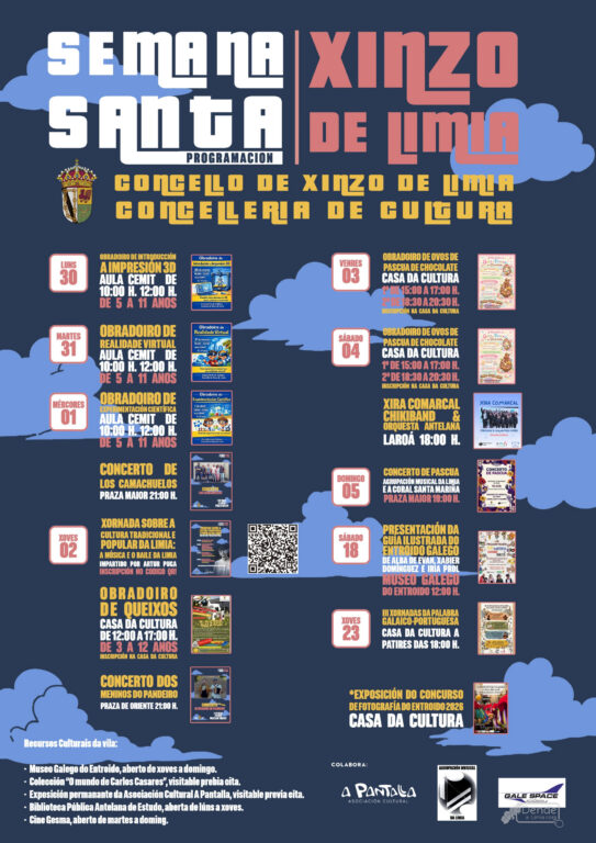 - Xoves 2 de abril: 12:00–17:00 h. Obradoiro de Queixos (Casa da Cultura). De 3 a 12 anos. 21:00 h. Concerto de Los Camachuelos na Praza Maior. Xornada de Cultura Tradicional da Limia con Artur Puga.
