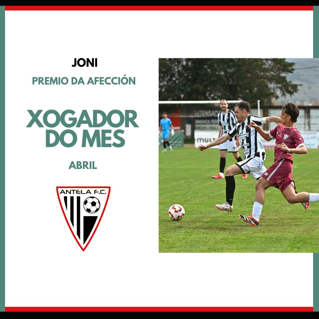 Jonathan Gómez Quintas, «Joni», capitán do Antela, foi elixido Xogador do Mes de abril pola afección, obtendo un 49% dos votos. O xogador recibira o premio, unha lámina de Xosé Lois Carreira, o 11 de maio na Moreira, antes do partido co Allariz, no que tamén levantará a copa de campión de Liga co Antela.