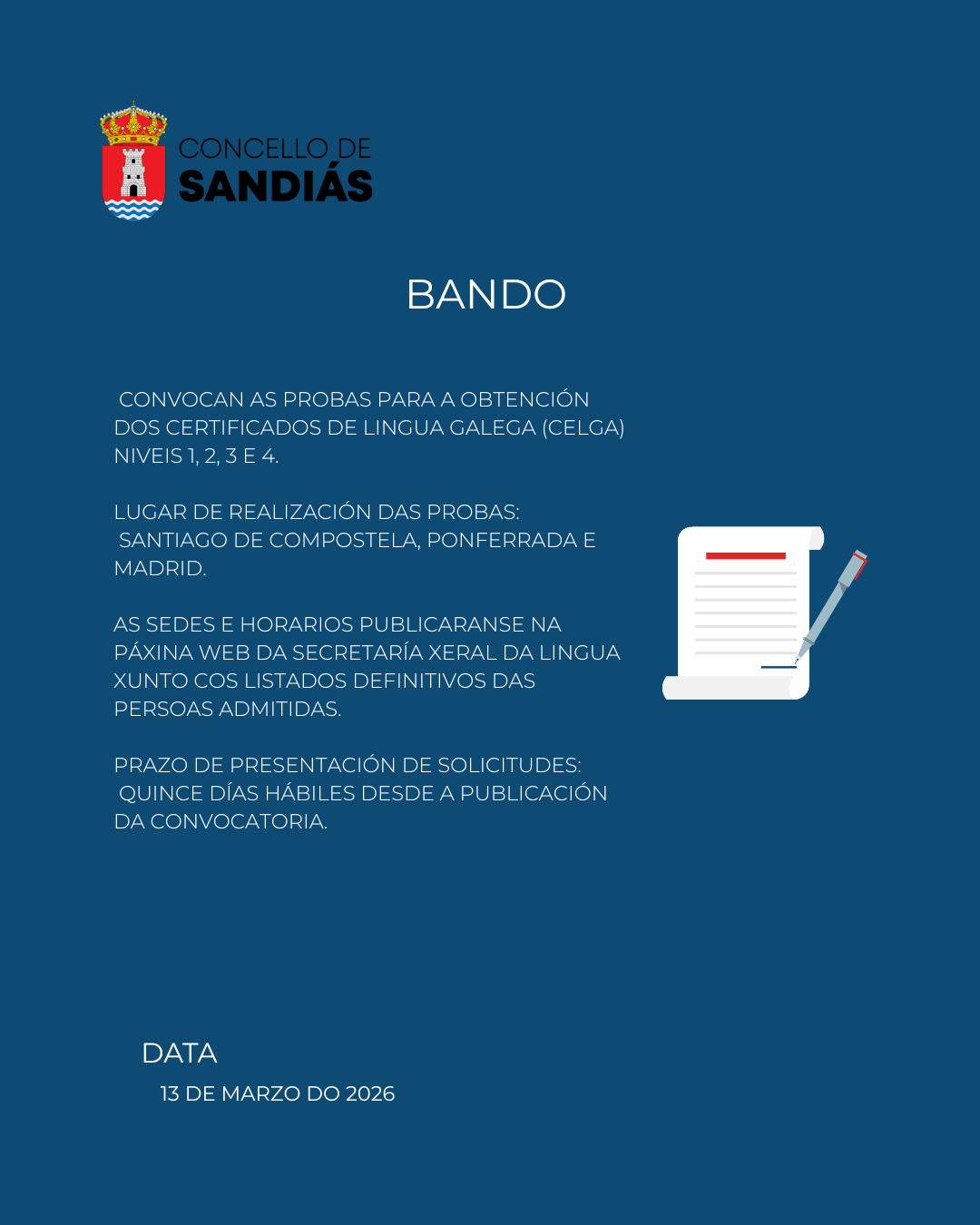 A Secretaría Xeral da Lingua convocou as probas para obter os certificados de lingua galega (Celga) niveis 1, 2, 3 e 4 no ano 2026, segundo a resolución publicada no DOG do 13 de marzo viernes, 13 marzo 2026 - 10:37 Concello de Sandiás concelloGeneralsandiás Fonte: www.sandias.es VER NOTICIA COMPLETA Artículos Relacionados Concello de Sandiás Paseo en familia por Piñeira de Arcos Mar 13, 2026 Concello de Sandiás Sandiás continúa co plan de mellora de refuxio de paradas coa instalación de novas marquesiñas na aldea de as pegas con códigos qr para consulta de horarios co teléfono móvil Mar 13, 2026 Concello de Sandiás Apertura do prazo de reserva de praza e solicitude de novo ingreso no Punto de Atención á Infancia (PAI) de Sandiás para o curso 2025/2026 Mar 12, 2026 Concello de Vilar de Santos PREINSCRICIÓN PARA CONCILIA DE SEMANA SANTA 2026 Mar 12, 2026