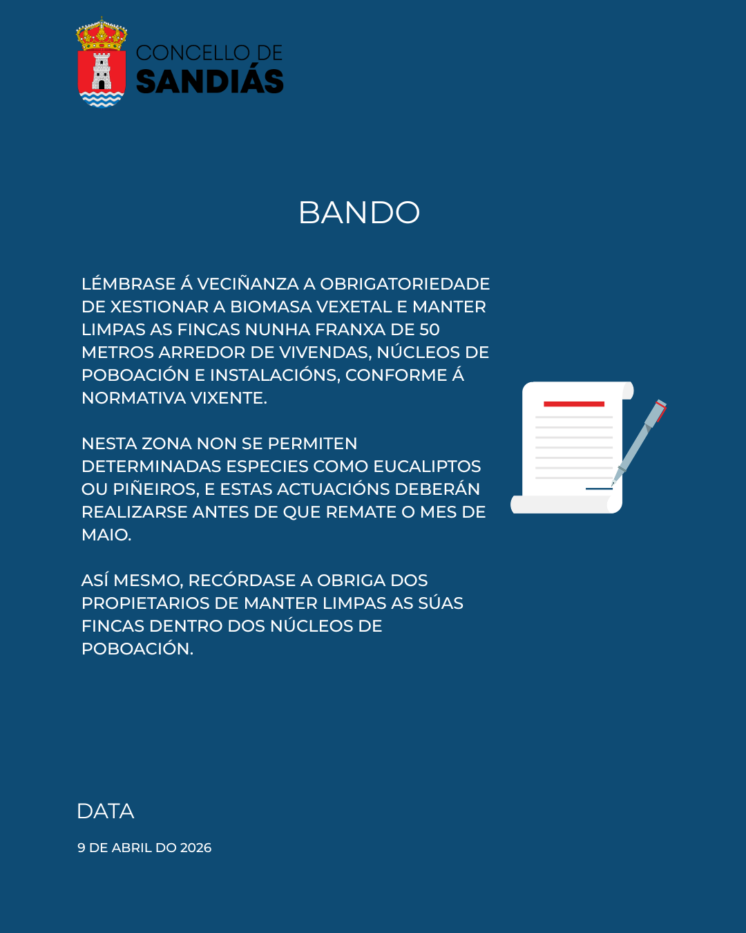 Lémbrase a obrigatoriedade de realizar a limpeza das fincas e a xestión da biomasa vexetal nunha franxa de 50 metros arredor de vivendas e núcleos de poboación jueves, 9 abril 2026 - 15:40 Concello de Sandiás concelloGeneralsandiás Fonte: www.sandias.es VER NOTICIA COMPLETA Artículos Relacionados Concello de Sandiás ITV para vehículos agrícolas en Sandiás Abr 9, 2026 Concello de Sandiás O vindeiro venres 17 de abril, a volta ciclista “O Gran Camiño” pasará por Sandiás Abr 9, 2026 Concello de Sandiás 👨👩👧👦🌿 Xincana en familia en Sandiás Abr 8, 2026 Concello de Sandiás Curso de Manexo de Motoserras en Entrimo Abr 6, 2026