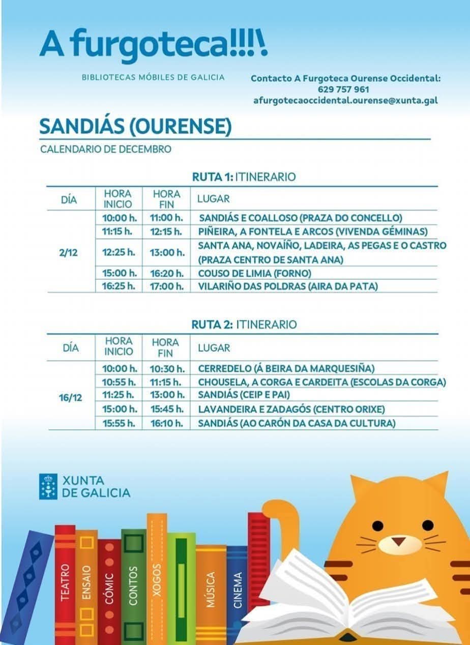 Nova cita coa Furgoteca en Sandiás na ruta do martes 16 de Decembro! lunes, 15 diciembre 2025 - 14:33 Concello de Sandiás concelloGeneralsandiás Fonte: www.sandias.es VER NOTICIA COMPLETA Artículos Relacionados Concello de Vilar de Santos Dic 15, 2025 Concello de Sandiás Cea de nadal dos traballadores e traballadoras do concello de Sandiás Dic 15, 2025 Concello de Sandiás O espirito do nadal 2025 chega a Sandiás Dic 15, 2025 Concello de Vilar de Santos EN VILAR DE SANTOS OS REIS VAN Á TUA ALDEA Dic 15, 2025