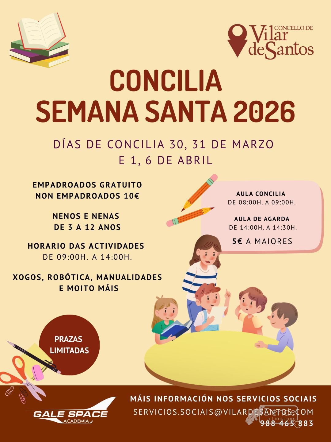 O Concello de Vilar de Santos abriu o prazo de preinscrición para o programa «Concilia de Semana Santa 2026». Esta iniciativa está deseñada para nenos e nenas de 3 a 12 anos co obxectivo de axudar ás familias a conciliar durante as vacacións.