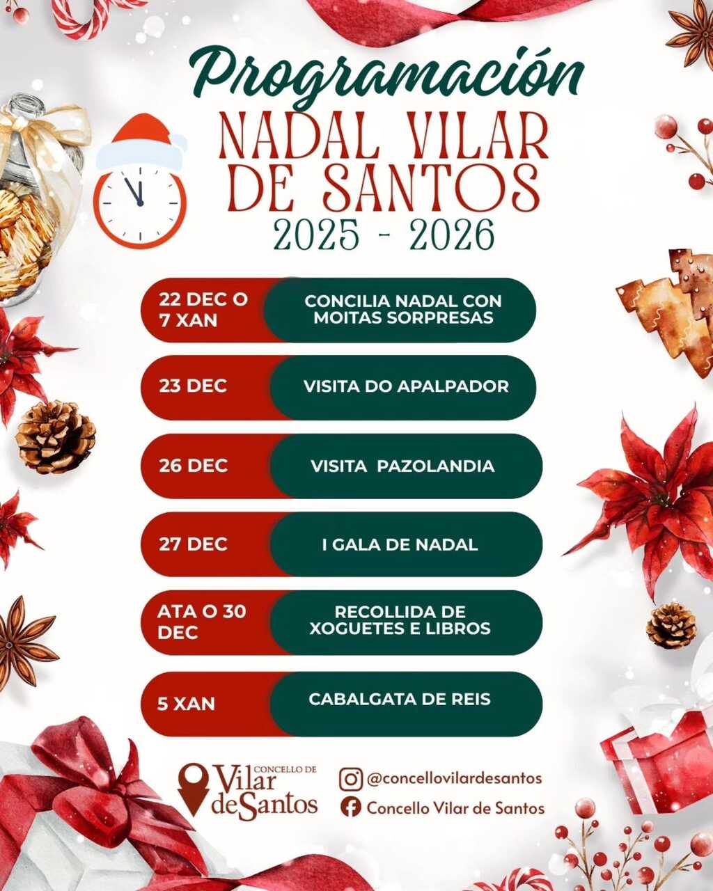 O Concello de Vilar de Santos presentou a súa programación de Nadal, deseñada para fomentar a convivencia, a ilusión e a participación veciñal dende o 22 de decembro ata o 7 de xaneiro.