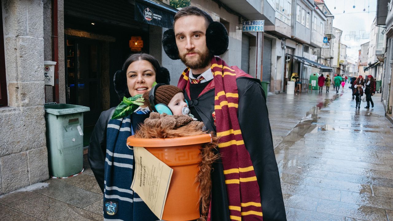 Desde Salamanca llegaron Vega Martín y sus amigas, animadas por los novios de dos de ellas, que son músicos de una de las charangas que participa en el entroido, Queloque’s Band. Tuvieron que quedarse en un hostal en Allariz porque en Xinzo no encontraron alojamiento. «Y eso que lo miramos hace mes y medio», decía. «La verdad es que nos está pareciendo muy guay. Hay un ambiente buenísimo y ya hemos visto el mejor disfraz del mundo», confesaba. Se refería al que llevaban Cristina García, Luis Domínguez y su hija Suevia. Eligieron la temática de Harry Potter. Ellos eran dos estudiantes de Hogwarts y a su pequeña la vistieron de mandrágora. «Son unha friki desta película e sabía que en canto tiveramos un fillo quería disfrazarme así», confesaba Cristina. «Este é o noso primeiro entroido como pais e está sendo diferente, saíndo máis de día que de noite, pero moi bonito», apuntaba Luis.