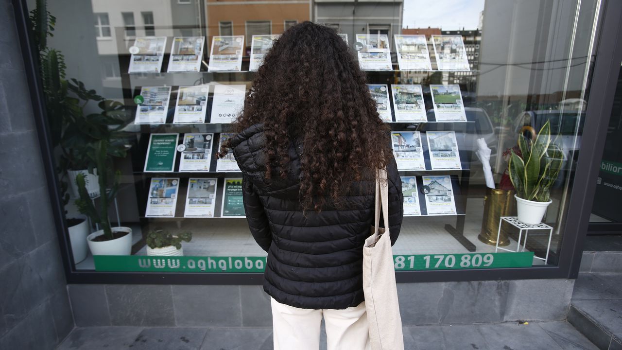 Una joven, ante los anuncios de pisos de una inmobiliaria en A Coruña. EDUARDO PÉREZ