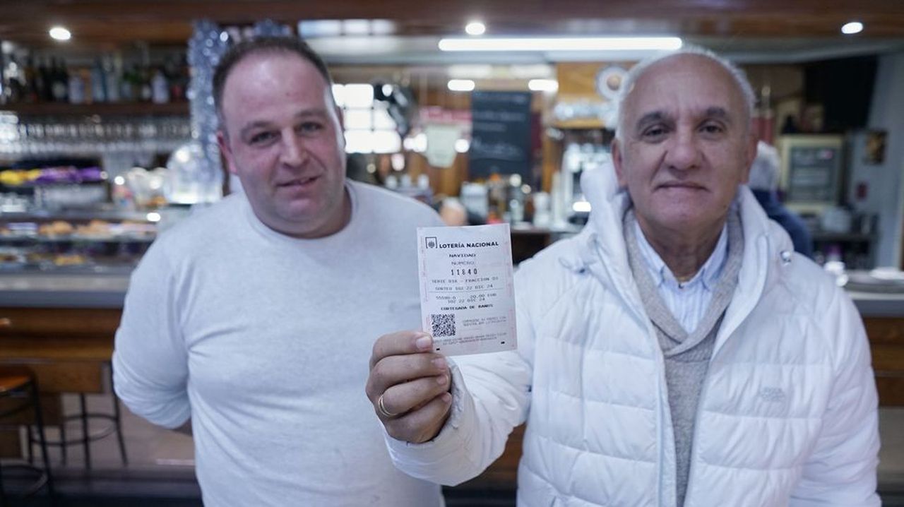 Alejandro Barrionuevo e Manuel Rivera celebraron a obtención dun décimo do terceiro premio en Cortegada. O número 11840, vendido no bar Rivera, que rexenta Alejandro Barrionuevo, repartiu 50.000 euros entre os máis de 40 membros da peña madridista Miño, fundada en 1996 e con sede no propio establecemento. Barrionuevo, que comezou a vender lotería en xullo, expresou a súa satisfacción por repartir sorte no seu primeiro sorteo.
