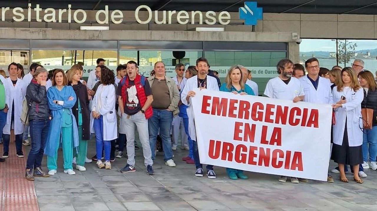 Doce semanas consecutivas saliendo a la calle para denunciar la falta de personal. Un miércoles más, la coordinadora de facultativos FiOu convocó una protesta para reclamar más medios humanos y exigir una sanidad digna, como recogían las pancartas desplegadas ante los centros de salud de Ourense, Xinzo de Limia o Leiro. A las puertas del CHUO, la demanda se dirige especialmente a Urgencias. «Están menos de la mitad de la plantilla», denuncian desde FiOu, lo que lleva a que se siga recurriendo a médicos de otras áreas sanitarias para cubrir las guardias.