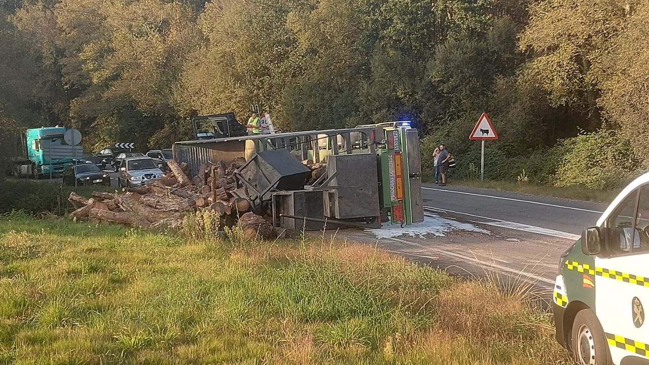 El conductor de un camión que transportaba troncos de madera y volcó esta tarde en la carretera OU-531, en el municipio ourensano de Ramirás, quedó atrapado en un primer momento dentro de la cabina. Finalmente pudo salir por su propio pie para recibir asistencia sanitaria. Fue trasladado en ambulancia, aunque en principio las heridas que presenta son de carácter leve.