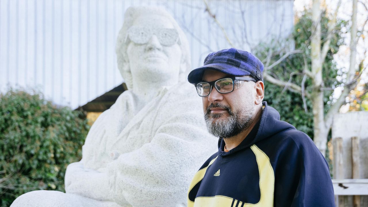 —Esta Olimpia Valencia ten case tres metros de alto. É unha escultura sedente que lembra ás celtíberas das mesmas características que foron atopadas aquí no ano 1971 e que levan medio século agochadas no Museo Arqueolóxico de Ourense. Pesa sobre unhas quince toneladas e está feita ao xeito clásico, en granito silvestre dunha canteira de Baltar.