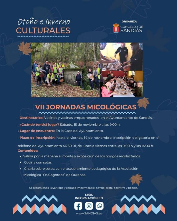 📅 O sábado 15 de Novembro, ás 09:00, terá lugar a VII Xornada Micolóxica, un roteiro guiado pola Asociación Micolóxica «Os Cogordos» (Ourense).👥Destinatarios: veciños e veciñas empadroados no Concello de Sandiás.🕤 Cando terá lugar?. Sábado, 15 de Novembro, ás 09:00. 📍 Lugar de encontro: na Casa do Concello. ✅ Cal é o prezo da actividade? Gratuito. 📲 Prazo […]