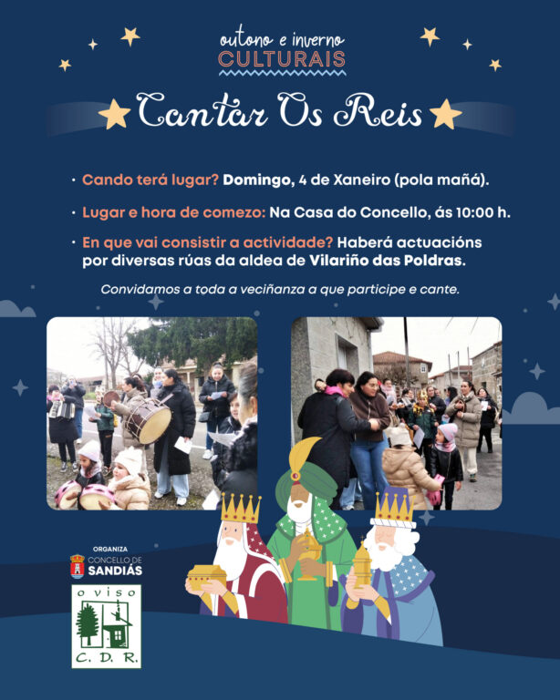 O Domingo, 4 de xaneiro, ás 10:00 h, comezaremos na Casa do Concello para despois percorrer as rúas da aldea de Vilariño das Poldras con música, alegría e tradición Unha oportunidade única para vivir unha das nosas tradicións máis especiais. Convidamos a toda a veciñanza a participar e gozar xuntos desta celebración